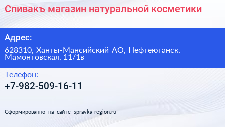 Спивакъ, магазин натуральной косметики по адресу 628310, Ханты-Мансийский АО, Нефтеюганск, Мамонтовская, 11/1в в дальнейшем Организация, размещена в следующих категориях: