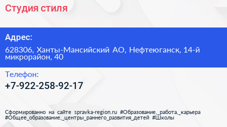 Студия стиля по адресу 628306, Ханты-Мансийский АО, Нефтеюганск, 14-й микрорайон, 40 в дальнейшем Организация, размещена в следующих категориях: