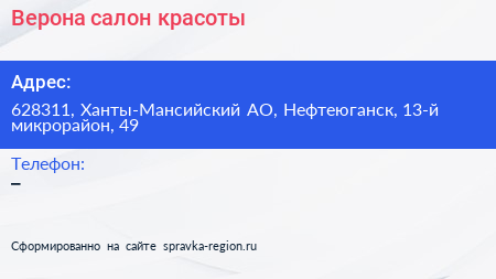 Верона, салон красоты по адресу 628311, Ханты-Мансийский АО, Нефтеюганск, 13-й микрорайон, 49 в дальнейшем Организация, размещена в следующих категориях: