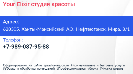 Your Elixir, студия красоты по адресу 628305, Ханты-Мансийский АО, Нефтеюганск, Мира, 8/1 в дальнейшем Организация, размещена в следующих категориях: