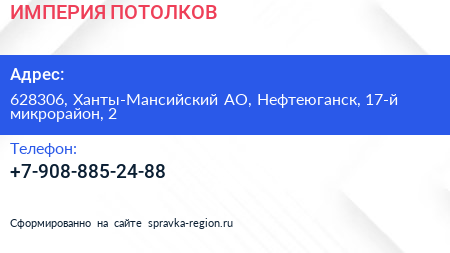 ИМПЕРИЯ ПОТОЛКОВ по адресу 628306, Ханты-Мансийский АО, Нефтеюганск, 17-й микрорайон, 2 в дальнейшем Организация, размещена в следующих категориях: