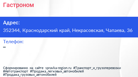 Гастроном по адресу 352344, Краснодарский край, Некрасовская, Чапаева, 36 в дальнейшем Организация, размещена в следующих категориях: