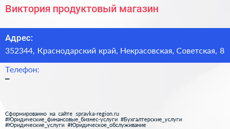Виктория, продуктовый магазин по адресу 352344, Краснодарский край, Некрасовская, Советская, 8 в дальнейшем Организация, размещена в следующих категориях: