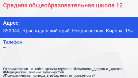 Средняя общеобразовательная школа №12 по адресу 352344, Краснодарский край, Некрасовская, Кирова, 15а в дальнейшем Организация, размещена в следующих категориях: