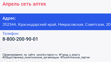 Апрель, сеть аптек по адресу 352344, Краснодарский край, Некрасовская, Советская, 20 в дальнейшем Организация, размещена в следующих категориях: