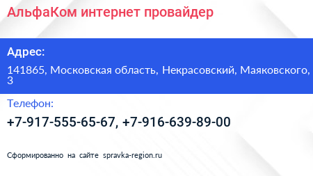 АльфаКом, интернет-провайдер по адресу 141865, Московская область, Некрасовский, Маяковского, 3 в дальнейшем Организация, размещена в следующих категориях:
