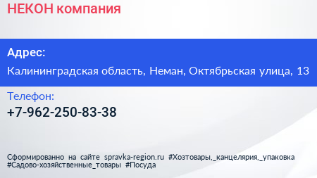 НЕКОН, компания по адресу Калининградская область, Неман, Октябрьская улица, 13 в дальнейшем Организация, размещена в следующих категориях: