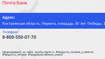 Почта Банк по адресу Костромская область, Нерехта, площадь 30 лет Победы, 1 в дальнейшем Организация, размещена в следующих категориях: