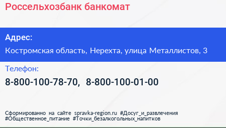 Россельхозбанк, банкомат по адресу Костромская область, Нерехта, улица Металлистов, 3 в дальнейшем Организация, размещена в следующих категориях: