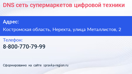 DNS, сеть супермаркетов цифровой техники по адресу Костромская область, Нерехта, улица Металлистов, 2 в дальнейшем Организация, размещена в следующих категориях: