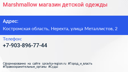 Marshmallow, магазин детской одежды по адресу Костромская область, Нерехта, улица Металлистов, 2 в дальнейшем Организация, размещена в следующих категориях: