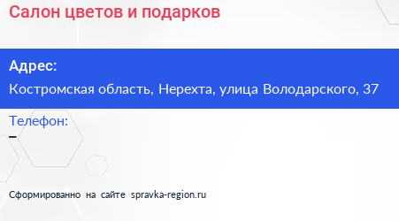Салон цветов и подарков по адресу Костромская область, Нерехта, улица Володарского, 37 в дальнейшем Организация, размещена в следующих категориях: