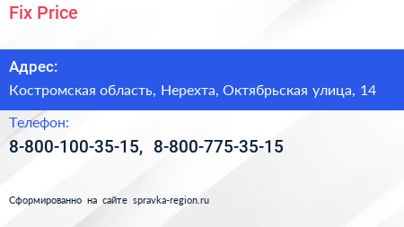 Fix Price по адресу Костромская область, Нерехта, Октябрьская улица, 14 в дальнейшем Организация, размещена в следующих категориях: