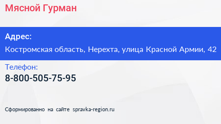 Мясной Гурман по адресу Костромская область, Нерехта, улица Красной Армии, 42 в дальнейшем Организация, размещена в следующих категориях: