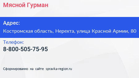 Мясной Гурман по адресу Костромская область, Нерехта, улица Красной Армии, 80 в дальнейшем Организация, размещена в следующих категориях: