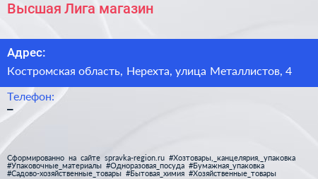 Высшая Лига, магазин по адресу Костромская область, Нерехта, улица Металлистов, 4 в дальнейшем Организация, размещена в следующих категориях: