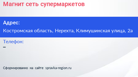 Магнит, сеть супермаркетов по адресу Костромская область, Нерехта, Климушинская улица, 2а в дальнейшем Организация, размещена в следующих категориях:
