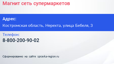 Магнит, сеть супермаркетов по адресу Костромская область, Нерехта, улица Бебеля, 3 в дальнейшем Организация, размещена в следующих категориях: