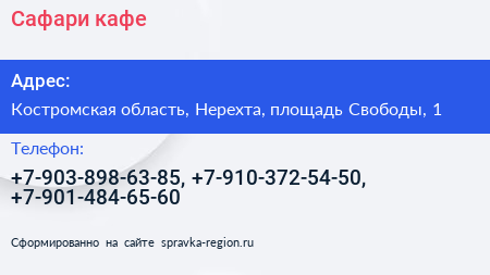 Сафари, кафе по адресу Костромская область, Нерехта, площадь Свободы, 1 в дальнейшем Организация, размещена в следующих категориях: