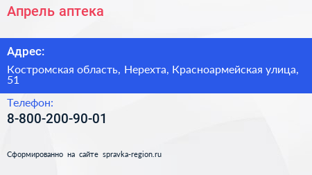 Апрель, аптека по адресу Костромская область, Нерехта, Красноармейская улица, 51 в дальнейшем Организация, размещена в следующих категориях:
