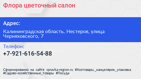 Флора, цветочный салон по адресу Калининградская область, Нестеров, улица Черняховского, 7 в дальнейшем Организация, размещена в следующих категориях:
