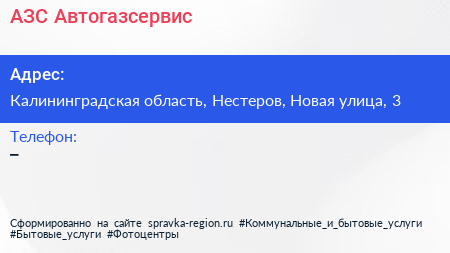 АЗС, Автогазсервис по адресу Калининградская область, Нестеров, Новая улица, 3 в дальнейшем Организация, размещена в следующих категориях: