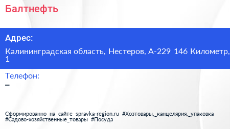 Балтнефть по адресу Калининградская область, Нестеров, А-229 146 Километр, 1 в дальнейшем Организация, размещена в следующих категориях: