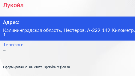 Лукойл по адресу Калининградская область, Нестеров, А-229 149 Километр, 1 в дальнейшем Организация, размещена в следующих категориях: