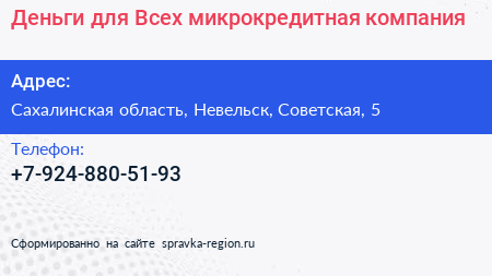 Деньги для Всех, микрокредитная компания по адресу Сахалинская область, Невельск, Советская, 5 в дальнейшем Организация, размещена в следующих категориях: