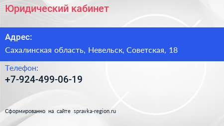 Юридический кабинет по адресу Сахалинская область, Невельск, Советская, 18 в дальнейшем Организация, размещена в следующих категориях: