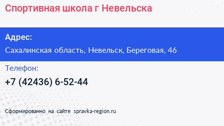 Спортивная школа г. Невельска по адресу Сахалинская область, Невельск, Береговая, 46 в дальнейшем Организация, размещена в следующих категориях: