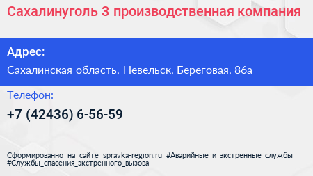Сахалинуголь-3, производственная компания по адресу Сахалинская область, Невельск, Береговая, 86а в дальнейшем Организация, размещена в следующих категориях: