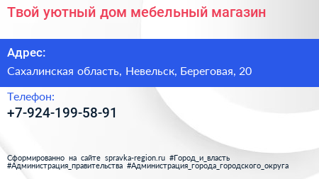 Твой уютный дом, мебельный магазин по адресу Сахалинская область, Невельск, Береговая, 20 в дальнейшем Организация, размещена в следующих категориях: