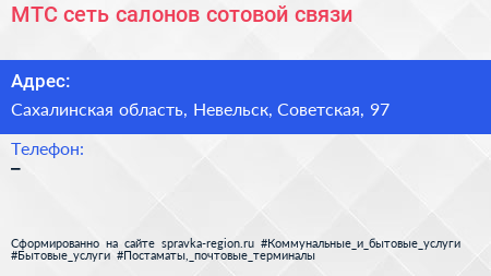 МТС, сеть салонов сотовой связи по адресу Сахалинская область, Невельск, Советская, 97 в дальнейшем Организация, размещена в следующих категориях:
