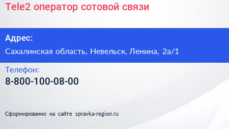 Tele2, оператор сотовой связи по адресу Сахалинская область, Невельск, Ленина, 2а/1 в дальнейшем Организация, размещена в следующих категориях: