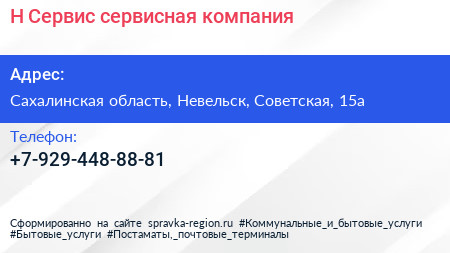 Н-Сервис, сервисная компания по адресу Сахалинская область, Невельск, Советская, 15а в дальнейшем Организация, размещена в следующих категориях: