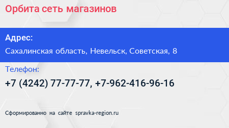 Орбита, сеть магазинов по адресу Сахалинская область, Невельск, Советская, 8 в дальнейшем Организация, размещена в следующих категориях: