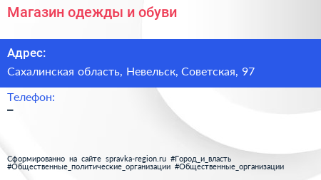 Магазин одежды и обуви по адресу Сахалинская область, Невельск, Советская, 97 в дальнейшем Организация, размещена в следующих категориях: