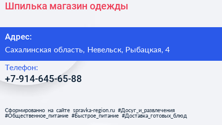 Шпилька, магазин одежды по адресу Сахалинская область, Невельск, Рыбацкая, 4 в дальнейшем Организация, размещена в следующих категориях: