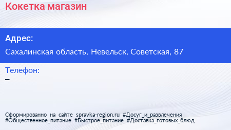 Кокетка, магазин по адресу Сахалинская область, Невельск, Советская, 87 в дальнейшем Организация, размещена в следующих категориях: