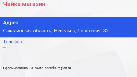 Чайка, магазин по адресу Сахалинская область, Невельск, Советская, 32 в дальнейшем Организация, размещена в следующих категориях: