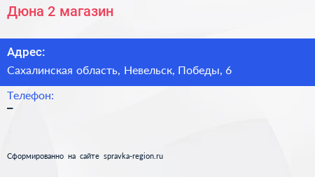 Дюна-2, магазин по адресу Сахалинская область, Невельск, Победы, 6 в дальнейшем Организация, размещена в следующих категориях: