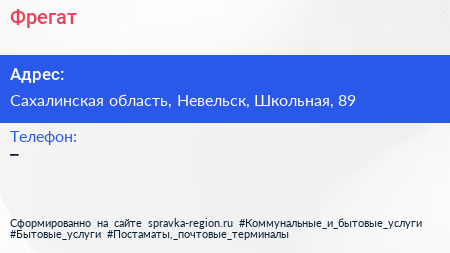 Фрегат по адресу Сахалинская область, Невельск, Школьная, 89 в дальнейшем Организация, размещена в следующих категориях: