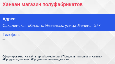 Ханаан, магазин полуфабрикатов по адресу Сахалинская область, Невельск, улица Ленина, 5/7 в дальнейшем Организация, размещена в следующих категориях: