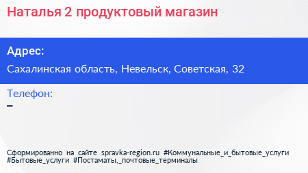 Наталья 2, продуктовый магазин по адресу Сахалинская область, Невельск, Советская, 32 в дальнейшем Организация, размещена в следующих категориях:
