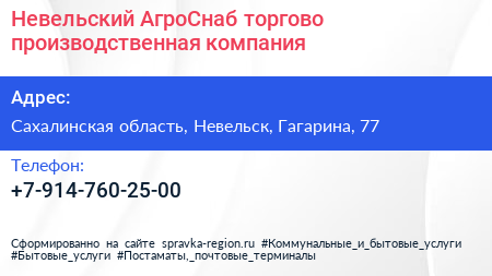 Невельский АгроСнаб, торгово-производственная компания по адресу Сахалинская область, Невельск, Гагарина, 77 в дальнейшем Организация, размещена в следующих категориях: