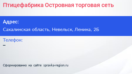 Птицефабрика Островная, торговая сеть по адресу Сахалинская область, Невельск, Ленина, 2Б в дальнейшем Организация, размещена в следующих категориях: