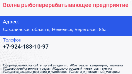 Волна, рыбоперерабатывающее предприятие по адресу Сахалинская область, Невельск, Береговая, 86а в дальнейшем Организация, размещена в следующих категориях: