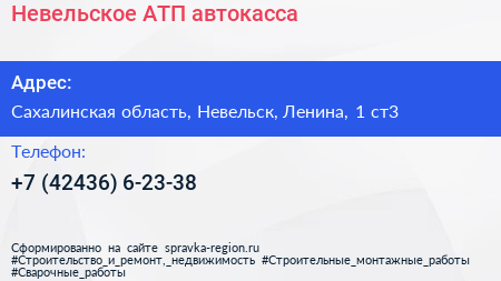 Невельское АТП, автокасса по адресу Сахалинская область, Невельск, Ленина, 1 ст3 в дальнейшем Организация, размещена в следующих категориях: