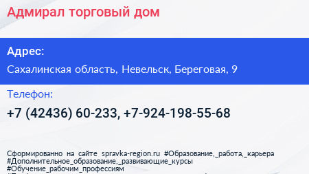 Адмирал, торговый дом по адресу Сахалинская область, Невельск, Береговая, 9 в дальнейшем Организация, размещена в следующих категориях: